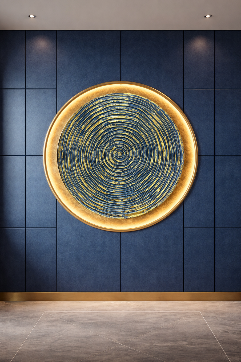 Each composition combines modular decorative panels with a sculptural centerpiece, enhanced by metallic detailing and optional LED backlighting.